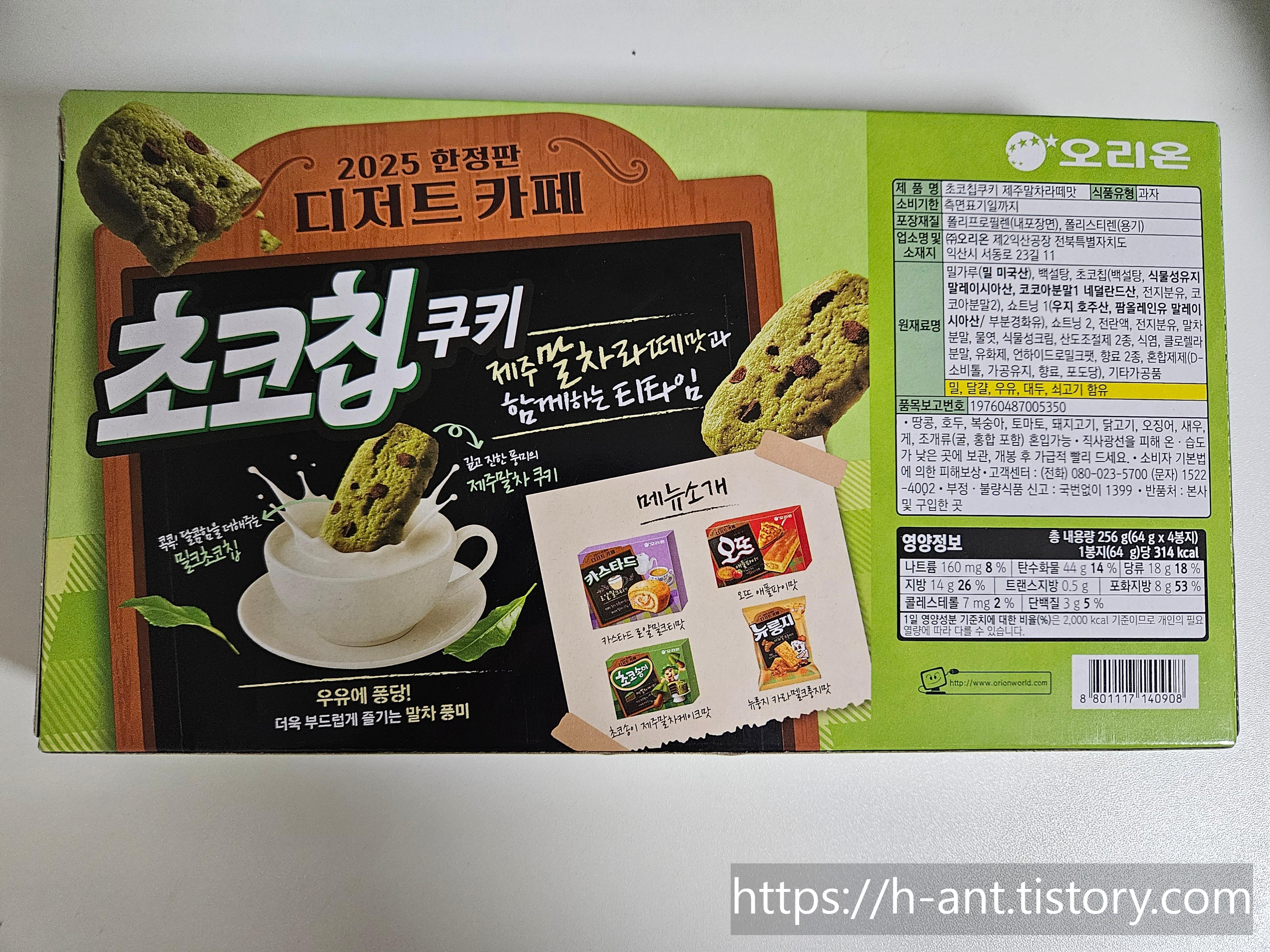오리온의 "2025 한정판 디저트 카페" 초코칩쿠키 제주말차라떼맛 입니다.